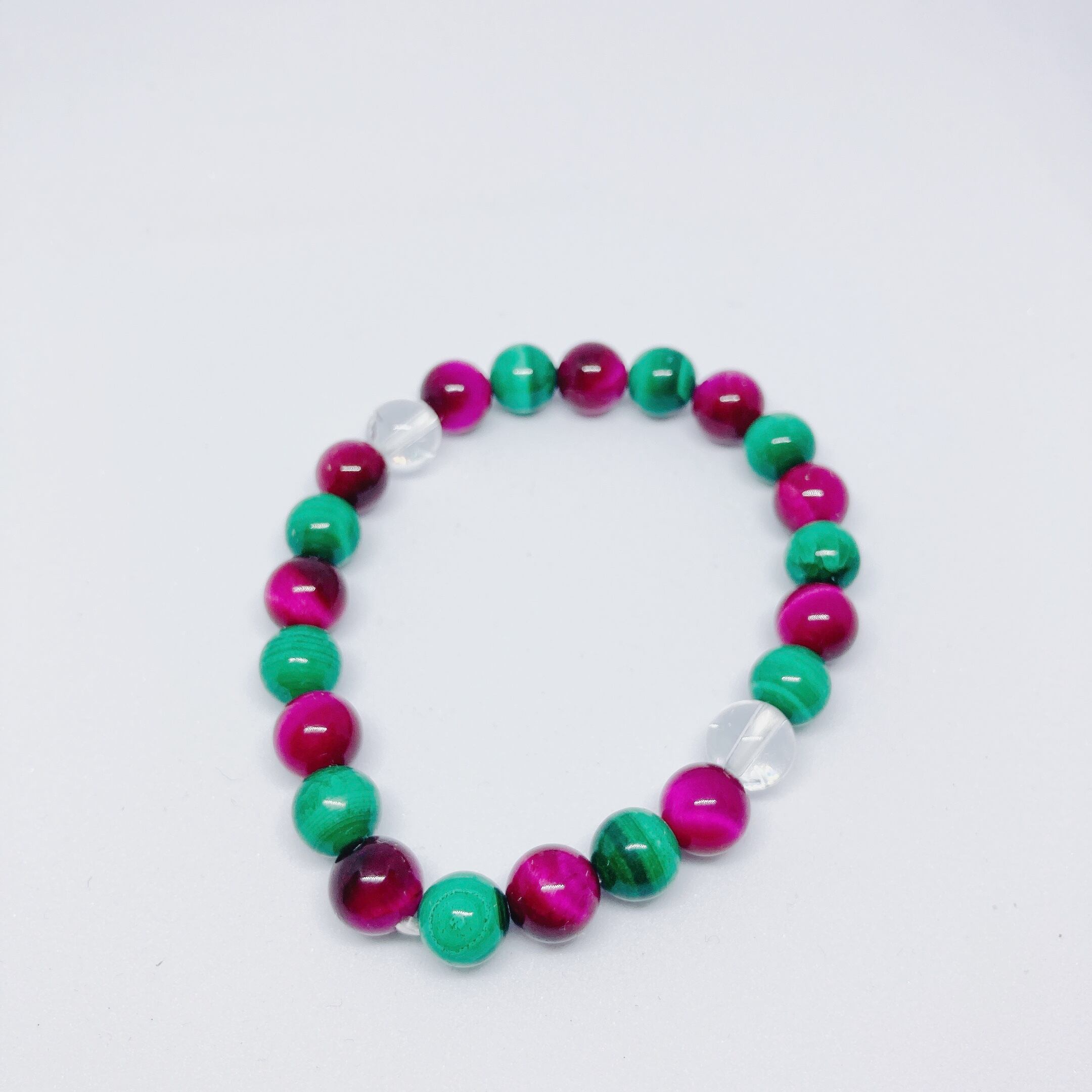 ローズタイガーアイ・マラカイト・水晶の美しいグラデーションが特徴のブレスレット。自分自身を癒し、パワーアップさせてくれるパワーストーン。 3つの大地の力が集まったローズタイガーアイ・マラカイト・水晶のパワーが、このブレスレットに閉じ込められています。ローズタイガーアイは、ストレスを解消し、心身ともに安定をもたらしてくれると言われています。マラカイトは、結果を生み出す強力なエネルギーを宿し、行動力を高める効果が期待できます。水晶は、浄化作用に優れ変容に導いてくれます。 手首に身につけることで、自分自身を癒し、パワーアップさせてくれます。美しいグラデーションが映えること間違いなし。 毎日のアクセントとして、自分へのご褒美や大切な人への贈り物にも最適です。 ※天然石のため、一つ一つ形や色合いが異なります。商品到着後は、専用布巾でやさしく拭いていただくようお願いいたします。