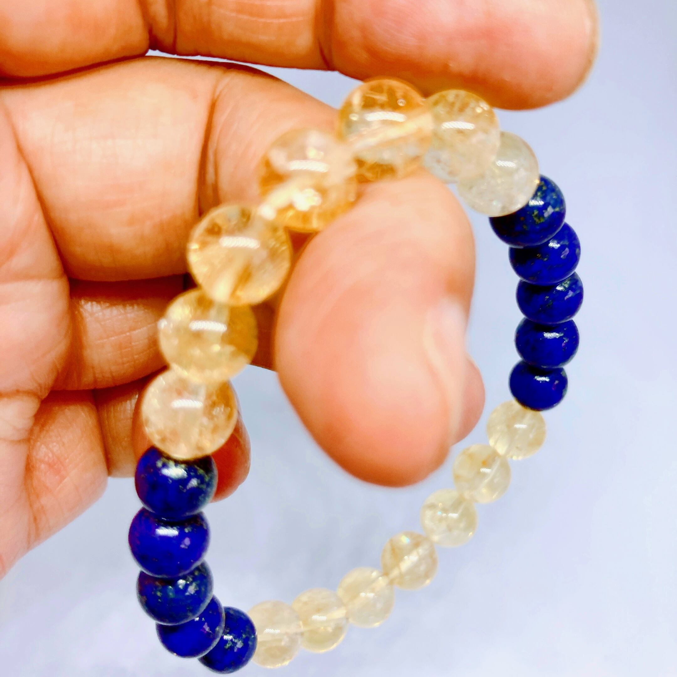 この天然石ブレスレットでは、ラピスラズリとシトリンを仕立て、色味が異なる石たちが重なり合った独自のデザインに仕上げました。一つ一つの石は自然のものが用いられており、風合いや模様が全く異なります。それゆえ、自分だけのオリジナルデザインが楽しめます。