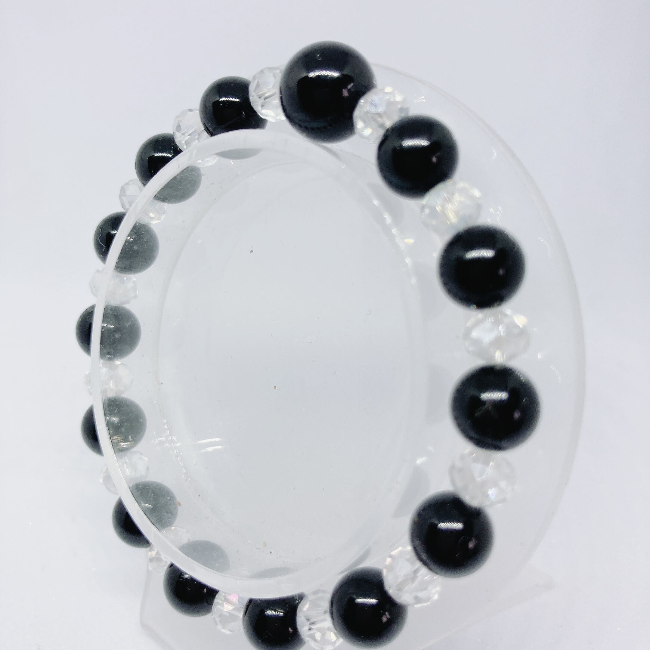 商品の生産・販売に至る経緯・ストーリー:全ての石には、その石本来持つパワーがあると言われます。その中でもオニキと水晶は、特に強いエネルギーを持つとされます。私たちは、そのパワーを活かしたアクセサリーを作ろうと考え、このブレスレットを手作りしました。自然の力を身に纏い、日々の生活をより充実したものにしてくれることを願っています。